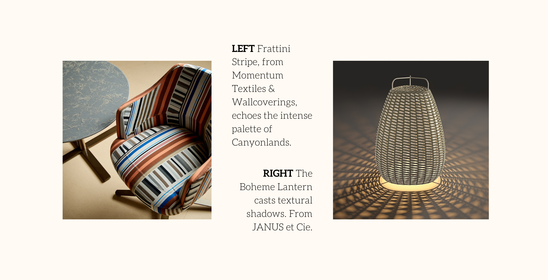 In Southeastern Utah—about a half hour from the town of Moab—is a place that is emblematic of the duality of nature’s power. Canyonlands National Park is where the Colorado and Green rivers converge. It’s the result of the sheer power of water over time carving a path through the solid stone. And yet, look at the ornate details that are left when these rushing waters recede: patterns have been pressed into rock, as delicate as lace. And the colors beneath the earth revealed as their own sort of shimmering rainbow. This juxtaposition of powerful gestures and intricate details is also a recipe for stirring home design.