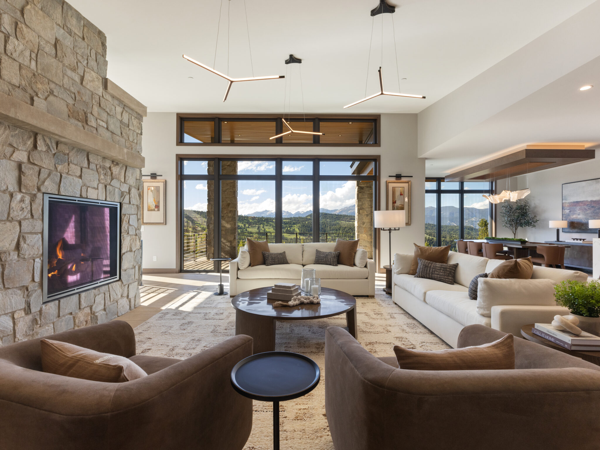 The great room’s floor-to-ceiling fireplace showcases Buechel Stone’s Silver Patina Castle Rock, which Speer carried in from the exterior, creating a seamless connection to the surrounding landscape.